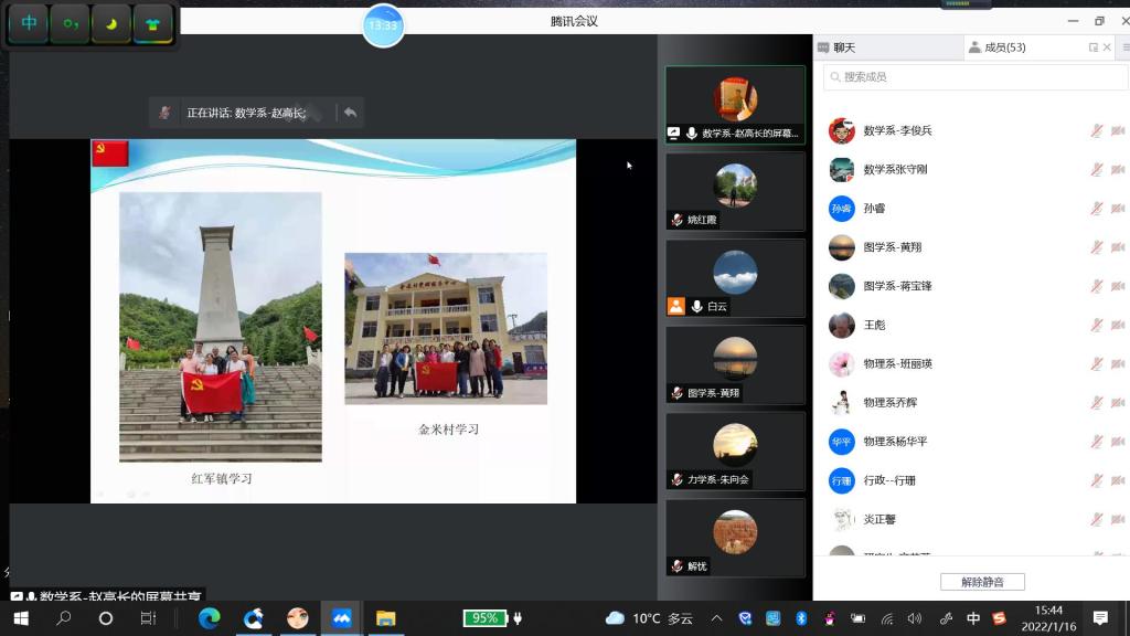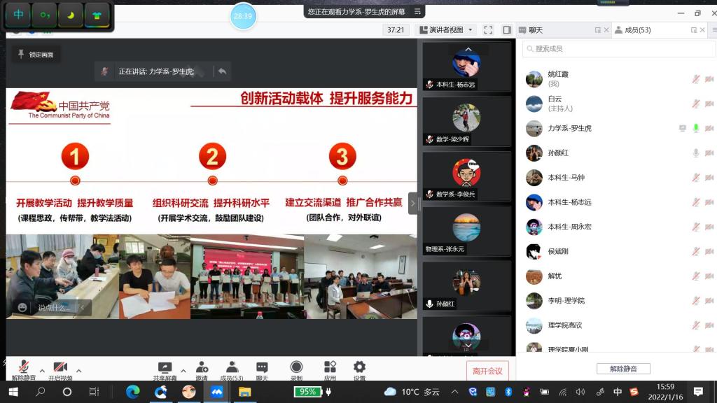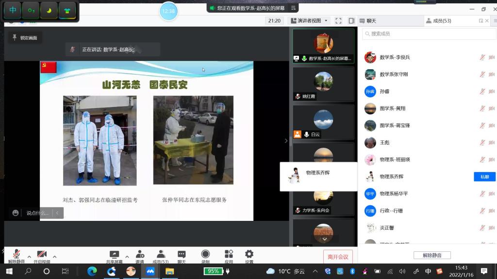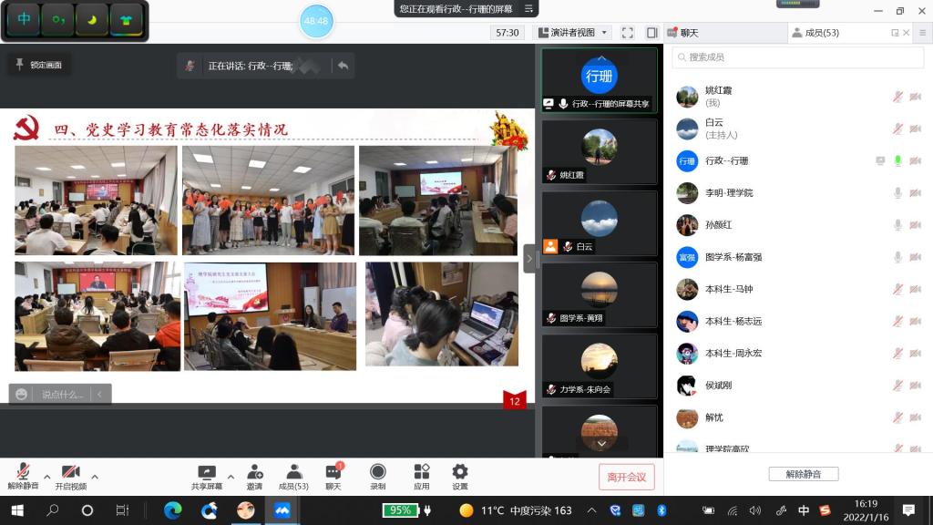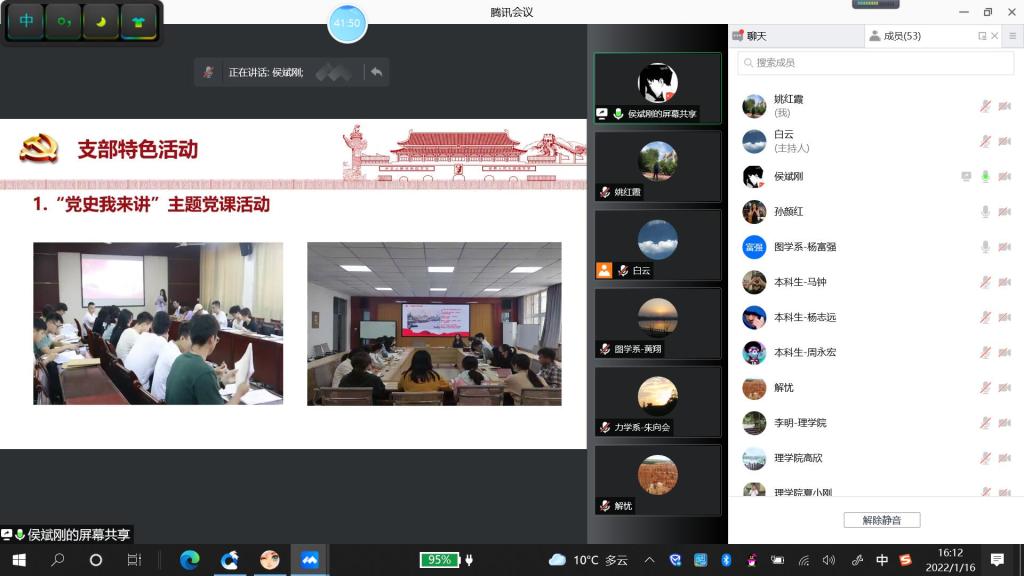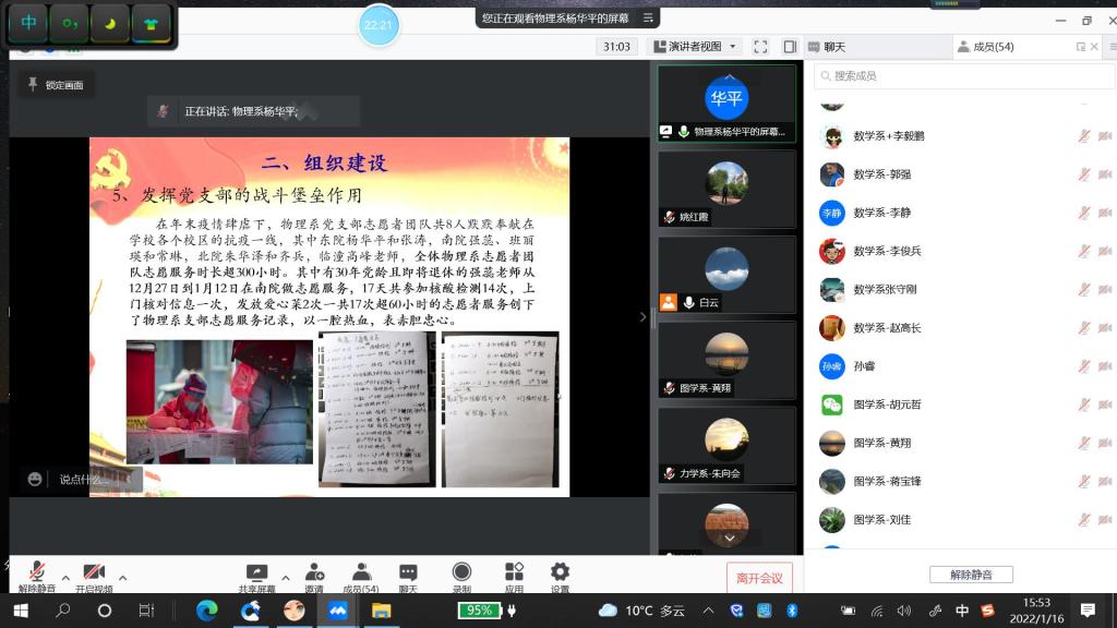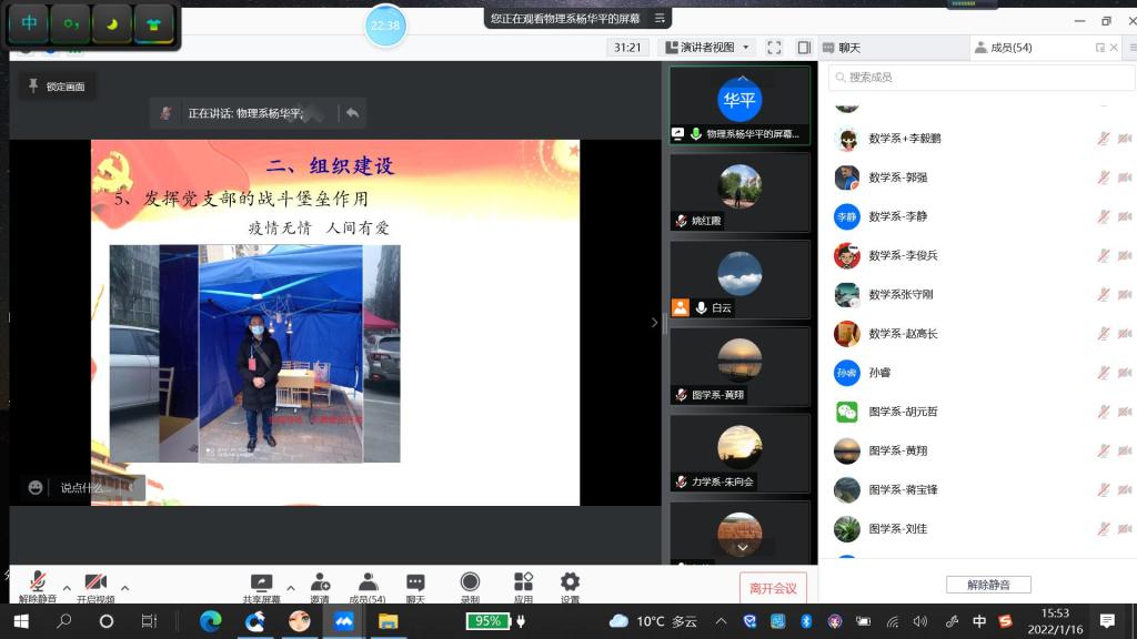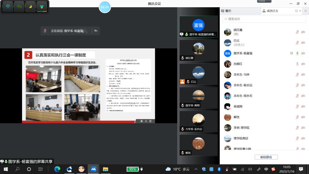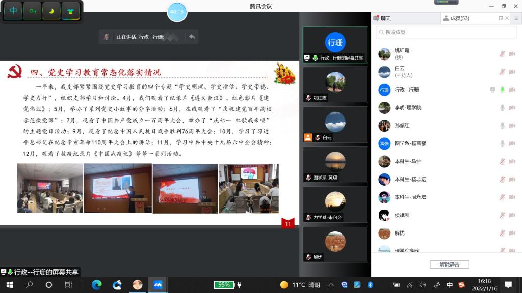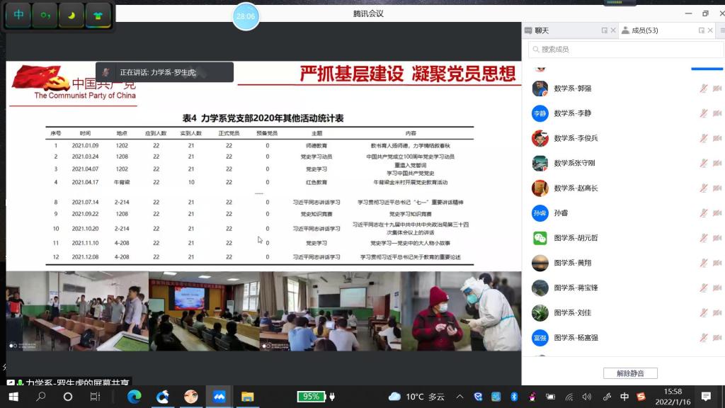 2022年1月16日下午,太阳成集团tyc122cc以腾讯会议平台召开了2021年度党支部书记抓党建述职评议考核会议。太阳成集团tyc122cc全体班子成员、党委委员、党支部书记及支委、系主任及党内外代表共53人参加会议。
