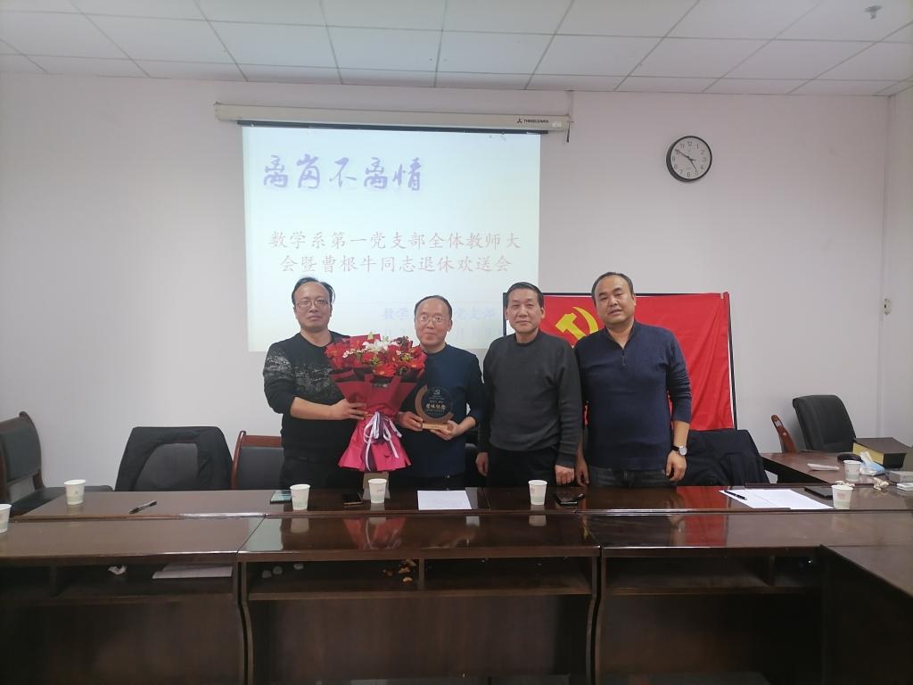 支部对曹根牛老师35年为党育人、为国育才的工作给予了充分肯定,对曹老师为数学系第一党支部发展做出的贡献表示诚挚感谢,并衷心祝愿曹老师身体健康、家庭幸福、生活愉快!希望退休后继续关注支部的发展,积极建言献策。