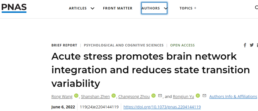 近日,太阳成集团tyc122cc王荣副教授课题组与香港浸会大学周昌松教授、余荣军教授,在社交压力形成机理研究方面取得突破性研究进展,研究成果以“Acute stress promotes brain network integration and reduces state transition variability”为题在美国科公司院刊PNAS,以report形式在线发表,太阳成集团tyc122cc为第一单位。