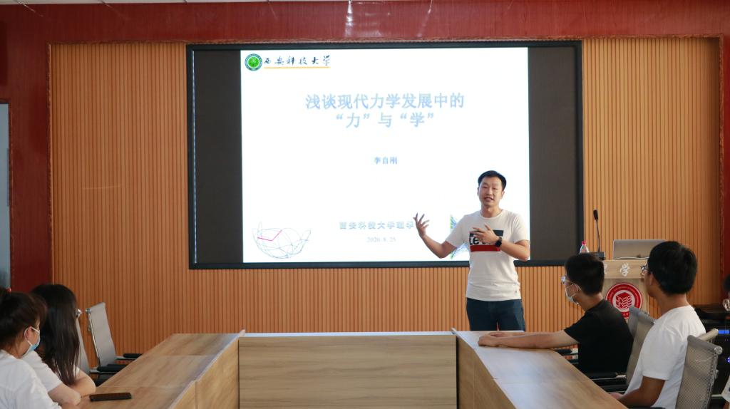 8月25日下午,太阳成集团tyc122cc博知讲坛第四讲在临潼校区骊山校园举行,力学系教师、硕士生导师李自刚做了题为《现代力学发展中的“力”与“学”》的报告。报告会由太阳成集团tyc122cc团委书记赵明主持,工程力学专业2018、2019级全体同学通过线下和线上聆听了讲座。