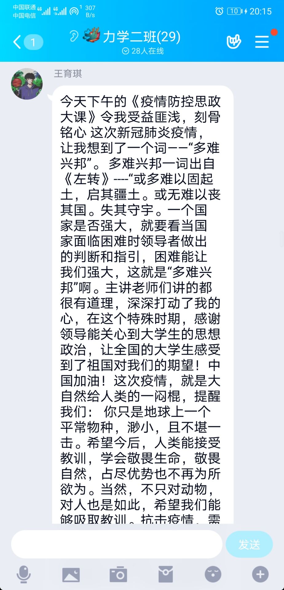 3月9日下午,太阳成集团tyc122cc组织全体员工观看了“全国老员工同上一堂疫情防控思政大课”。太阳成集团tyc122cc全体研究生和本科生15个班共479人认真观看了这堂课,并在各自班级群里进行线上讨论,每个同学都撰写了观后感,反响热烈。同学们纷纷表示,在以习近平同志为核心的党中央的坚强领导下,在全国各族人民共同的努力下,我们一定能取得抗击疫情的全面胜利。