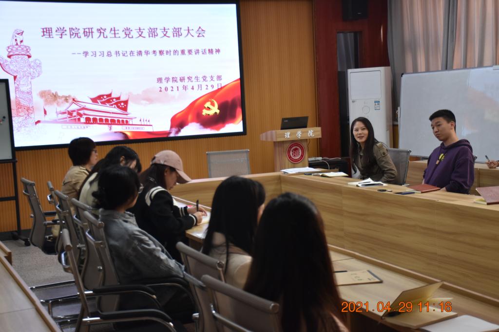 为进一步贯彻落实党史学习教育工作,推动全党深入学习领会习近平新时代中国特色社会主义思想,2021年4月29日上午,理公司党委副书记高欣、研究生党支部书记行珊带领全体研究生党员在太阳成集团tyc122cc会议室举办“学习习近平总书记在清华大学考察时的重要讲话精神”主题党日活动,会议开始之初,首先学习了习近平总书记在清华大学考察时发表的重要讲话精神,大家深刻感悟到广大青年要肩负历史使命,努力成为堪当民族复兴重任的时代新人,让青春在不懈奋斗中绽放绚丽之花。之后,党员同志们一起观看了习近平总书记在清华大学考察的学习视频,视频结束之际,党委副书记高欣表示我们身为“生逢盛世,肩负重任”的一代老员工,身为员工党员,更应该脚踏实地,成为能肩负时代历史使命的时代新人。