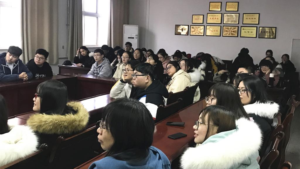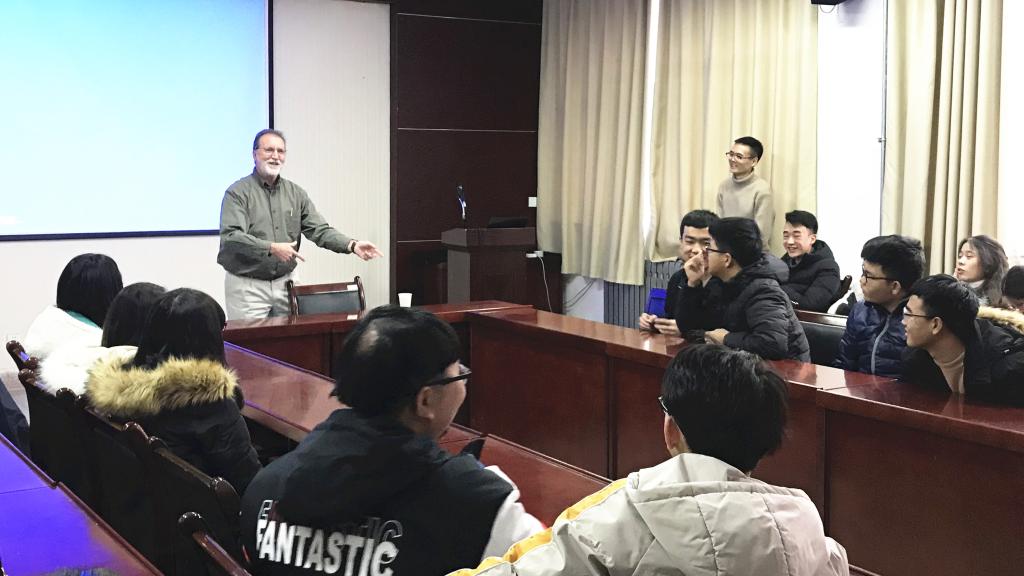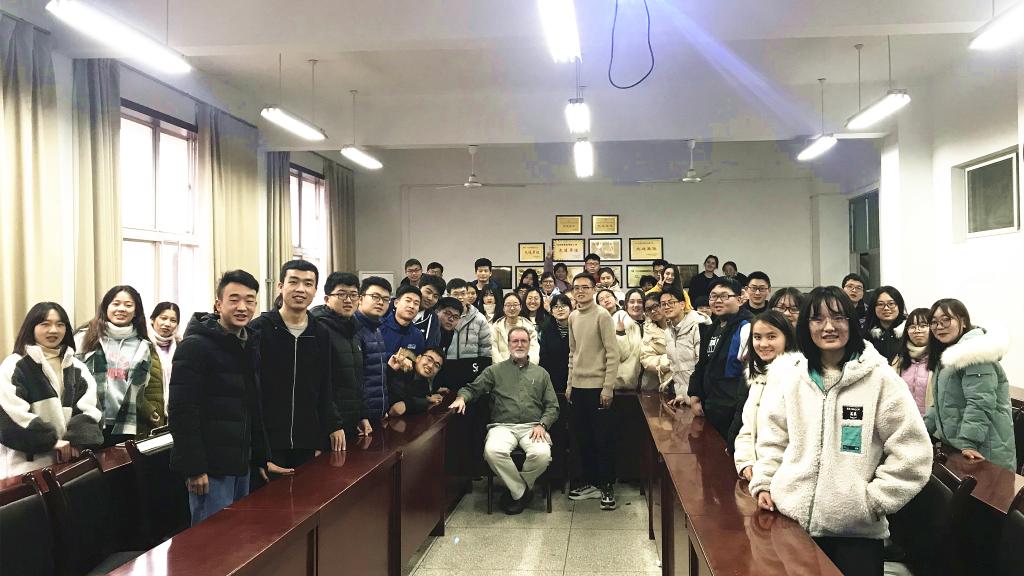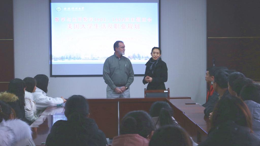 12月31日下午,太阳成集团tyc122cc数学与应用数学1902班班主任刘金瑄邀请公司外聘教授Terry E. Baxter给2019级数学专业两个班开展”美国老员工活及职业规划“主题班会,马哲博士担任翻译,辅导员赵明参加了班会。