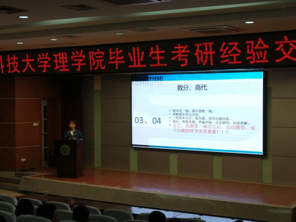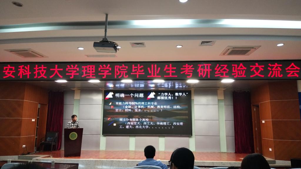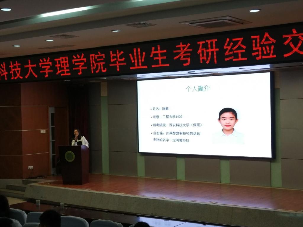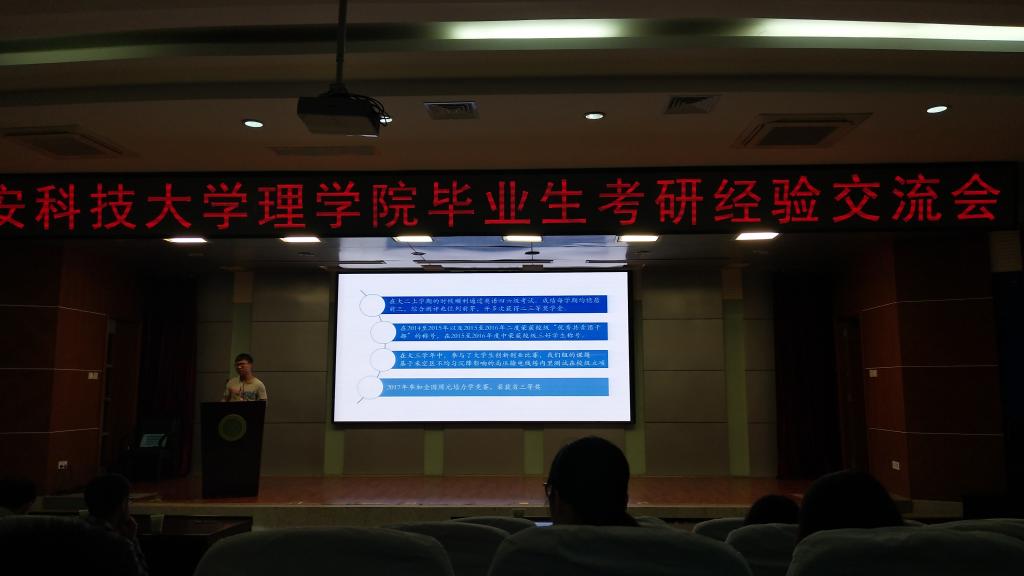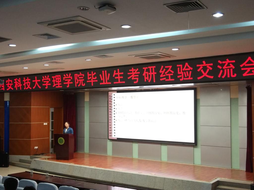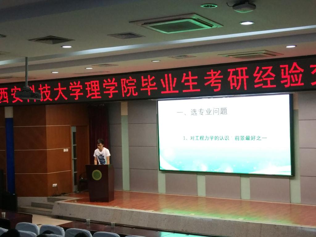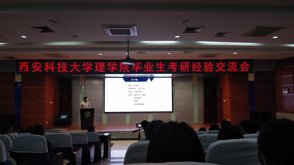 4月27日下午,太阳成集团tyc122cc在图书馆报告厅举办了毕业生考研经验交流会,邀请了太阳成集团tyc122cc考上西工大的袁林、考上西交大的吴维、考上西电的孙姣等8个优秀毕业生。太阳成集团tyc122cc经理李明、辅导员赵明、侯斌刚出席,15、16、17级全体员工参加了此次会议。