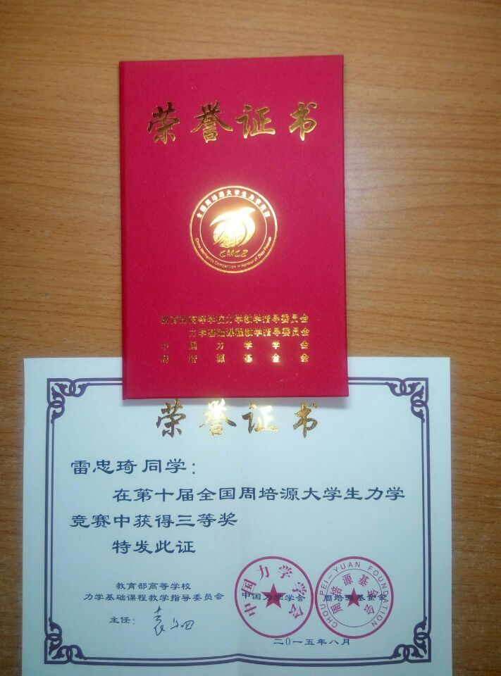 力学1202班雷忠琦同学在2015年第十届全国周培源老员工力学竞赛中获得三等奖