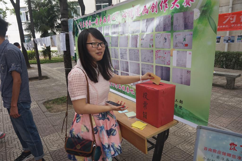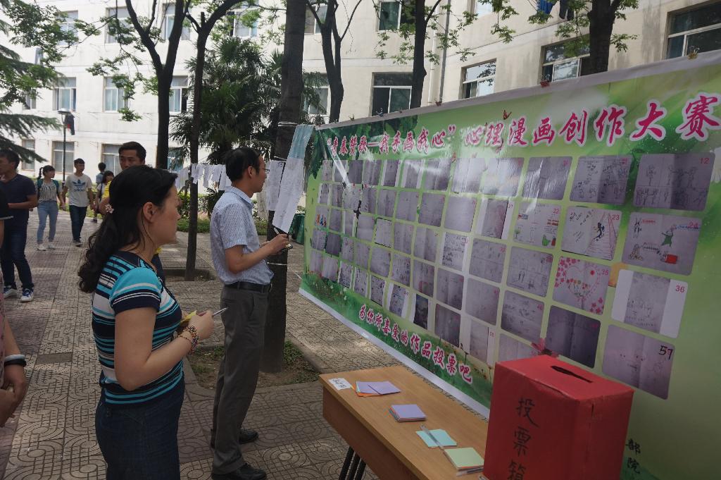 5月25日中午, “青春赞歌——我手画我心”心理漫画创作大赛活动在榴馨宛门前进行了最后的作品展出与投票环节,同学们积极参与,热情高涨,活动圆满落幕。