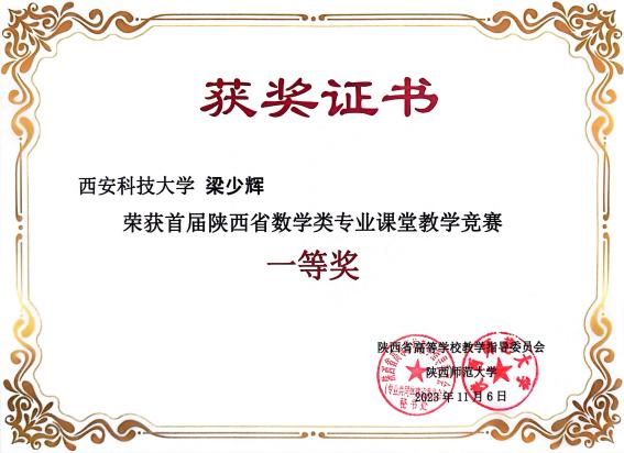 11月18日由陕西省高等公司教学指导委员会数理类工作委员会主办,西安电子科技大学数学与统计公司承办的第三届陕西省高等公司数学类专业建设研讨会隆重召开。来自全省30多所高校的陕西省高等公司教学指导委员、各高校数学类专业负责人和教师120余名代表参加了会议。太阳成集团tyc122cc经理张仲华教授带领公司数学系青年教师参加了会议。期间进行了首届陕西省高校数学专业课堂教学竞赛颁奖仪式,太阳成集团tyc122cc数学系教师梁少辉荣获一等奖。