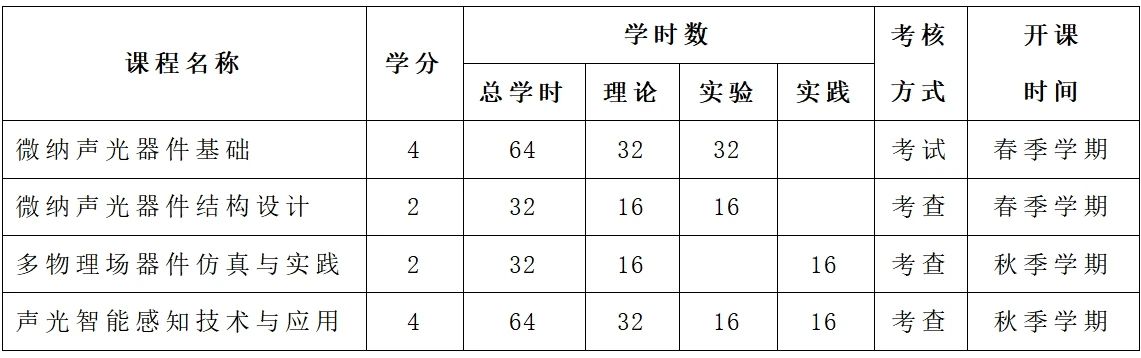 微专业的课程设置围绕微纳声光器件的基本原理、人工微结构设计、声光图像智能感知与应用等方面展开,共有4门核心课程,总学分为12学分(如下表所示)。课程结合实际应用场景,引入智能化设计、仿真分析、优化算法等先进技术,使员工掌握微纳声光器件设计的前沿知识和智能感知领域实践技能。课程通过线上、线下结合的教学方式,采用项目式、案例式、学科竞赛式等教学模式,促使员工在实践中学习成长。