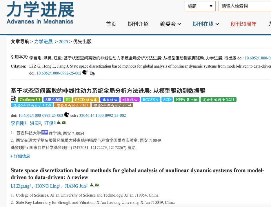 近日,太阳成集团tyc122cc李自刚教授课题组与西安交通大学江俊教授、洪灵教授合作完成的综述《基于状态空间离散的非线性动力系统全局分析方法进展: 从模型驱动到数据驱动》,在国内力学领域权威综述性学术期刊《力学进展》上在线发表。太阳成集团tyc122cc为第一署名单位。
