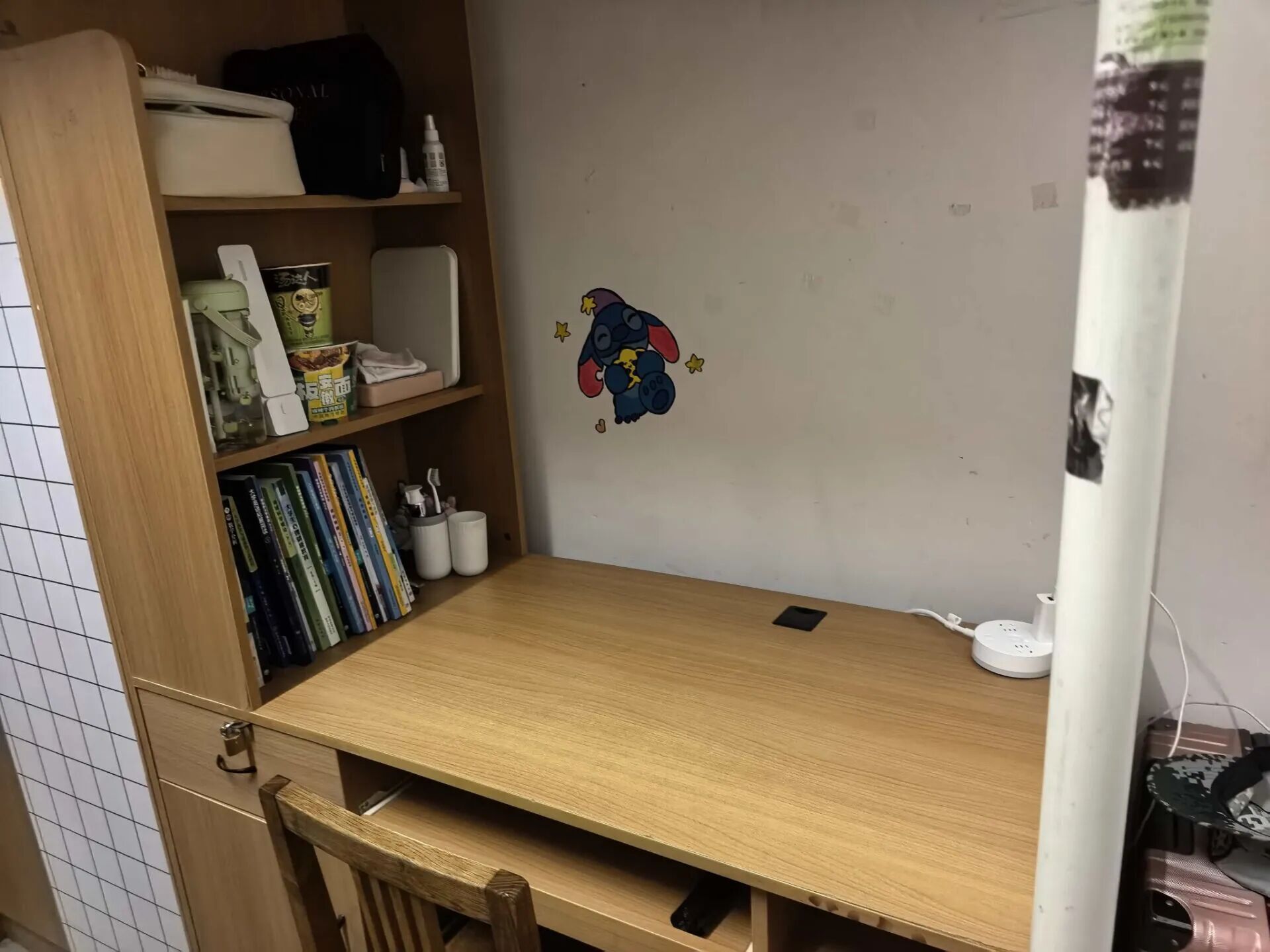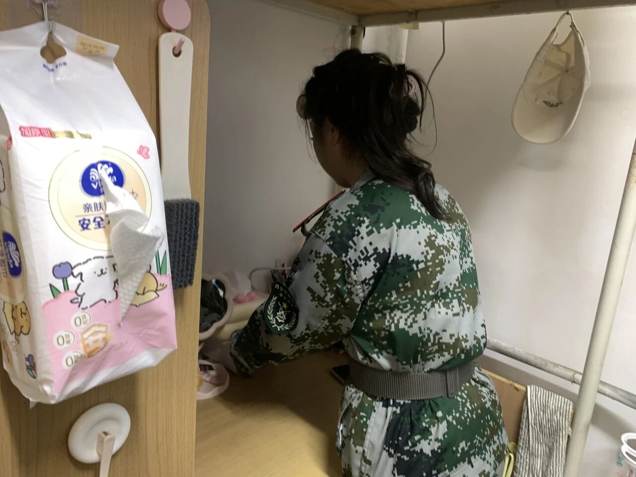 与此同时,“整理书桌”的战役也同步打响。教官对书桌整洁定下了明确标准:书籍需按尺寸大小分类竖立摆放,形成整齐的“书墙”;文具用品归置入笔筒,散乱的数据线用绑带束好,做到桌面无杂物,视野所及皆井然。教官一边指导一边强调,书桌是思想的阵地,一个整洁有序的环境是高效学习的基础,这份条理本身就是一种自律。
