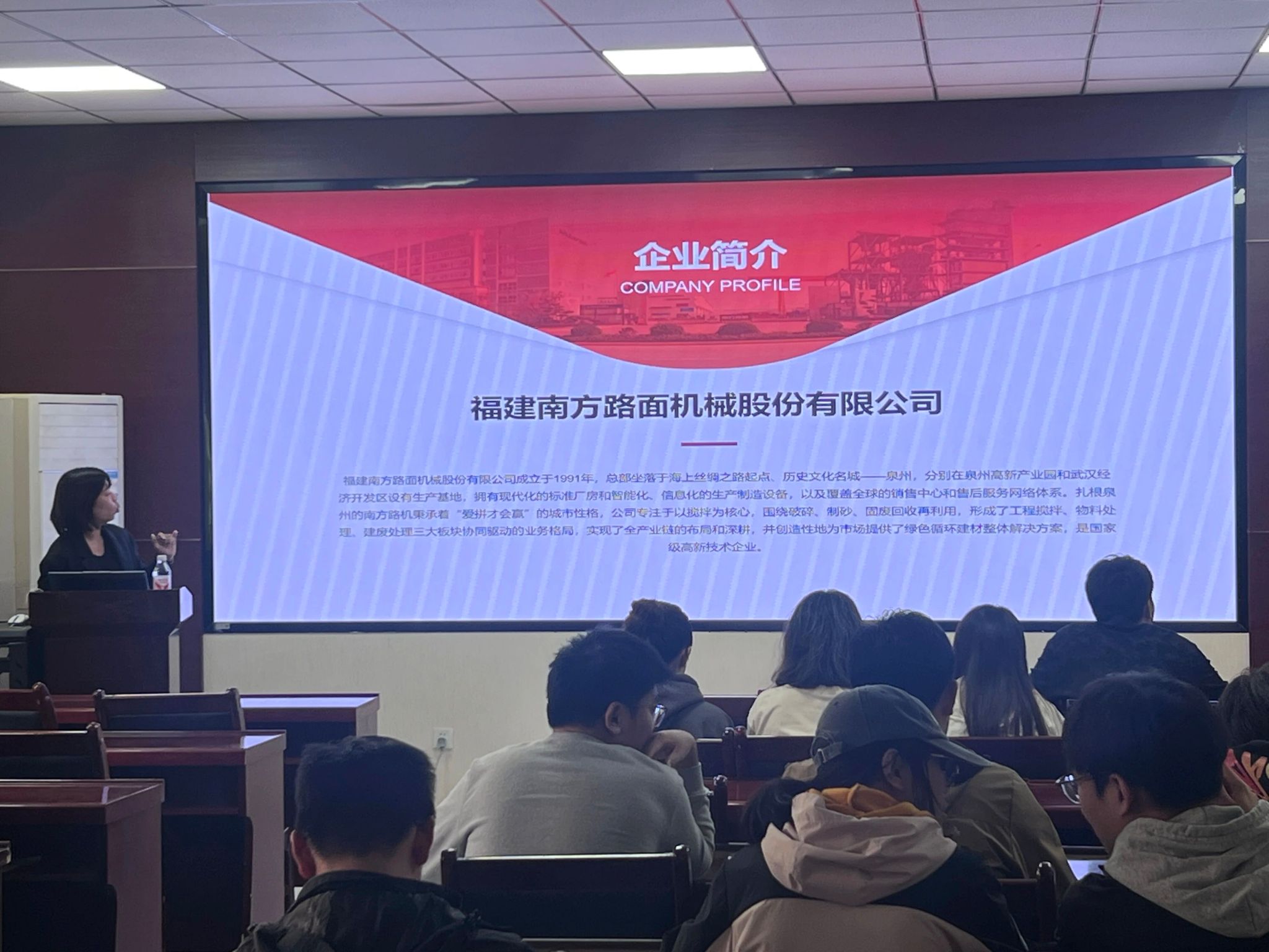招聘会上,南方路机招聘负责人首先介绍了企业概况,详细阐述了公司在工程装备制造领域的行业地位、核心业务布局及未来发展规划。作为国内工程机械装备领域的领军企业,南方路机在绿色建材装备、建筑废弃物资源化利用等方面的技术优势与创新成果,使同学们对企业的发展前景有了清晰认识。