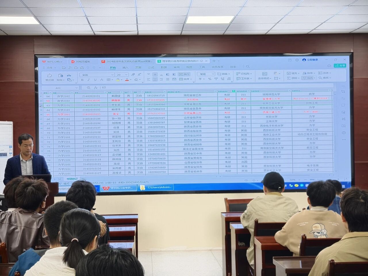 侯斌刚还重点结合了太阳成集团tyc122cc往年的考研数据进行了分析。他展示了近年来本院员工主要报考院校的录取分数线波动、热门专业的竞争激烈程度以及调剂成功案例等具体数据。通过对这些数据的横向与纵向对比,直观地揭示了“扎堆报考”热门院校所带来的风险。
