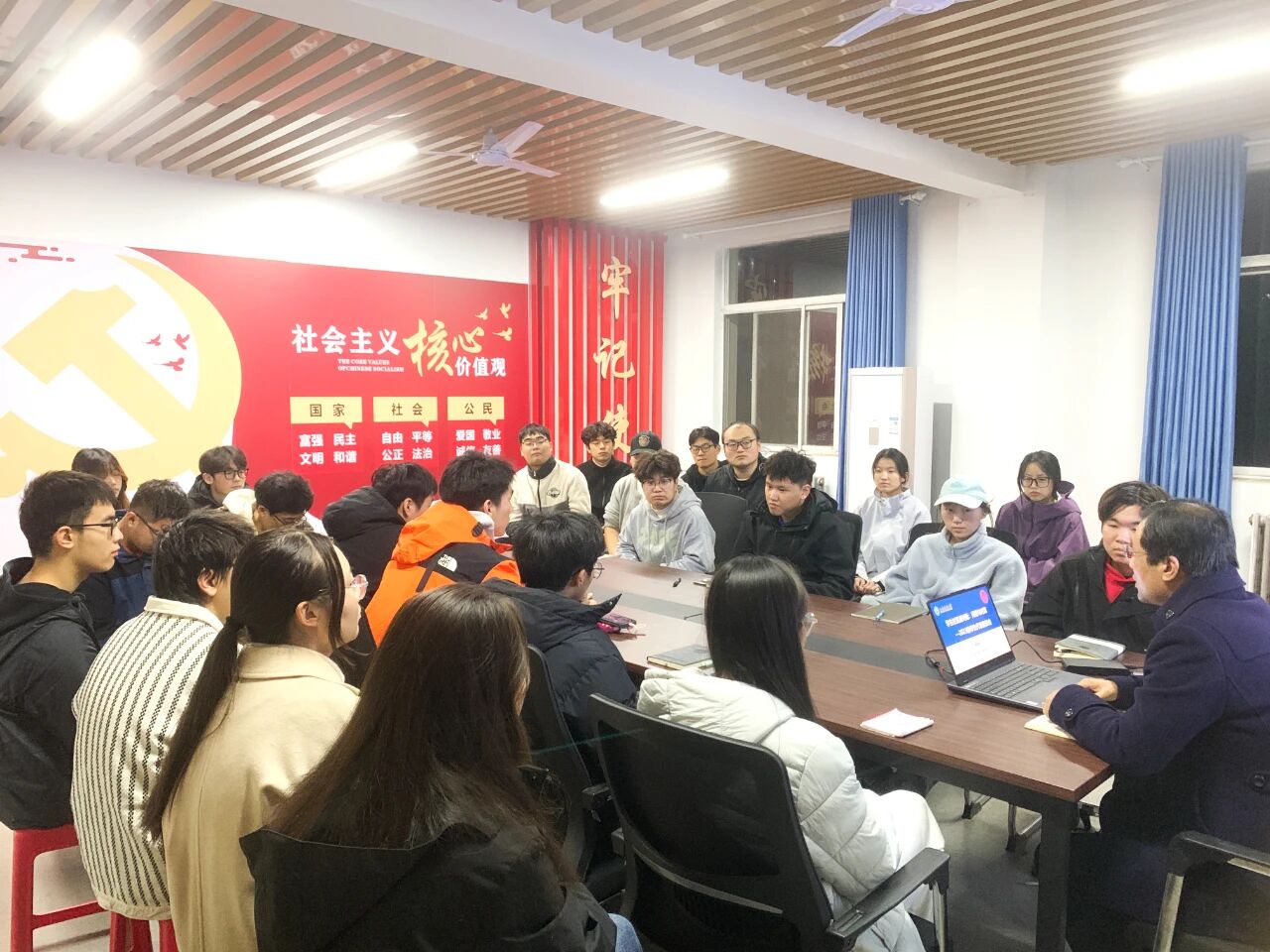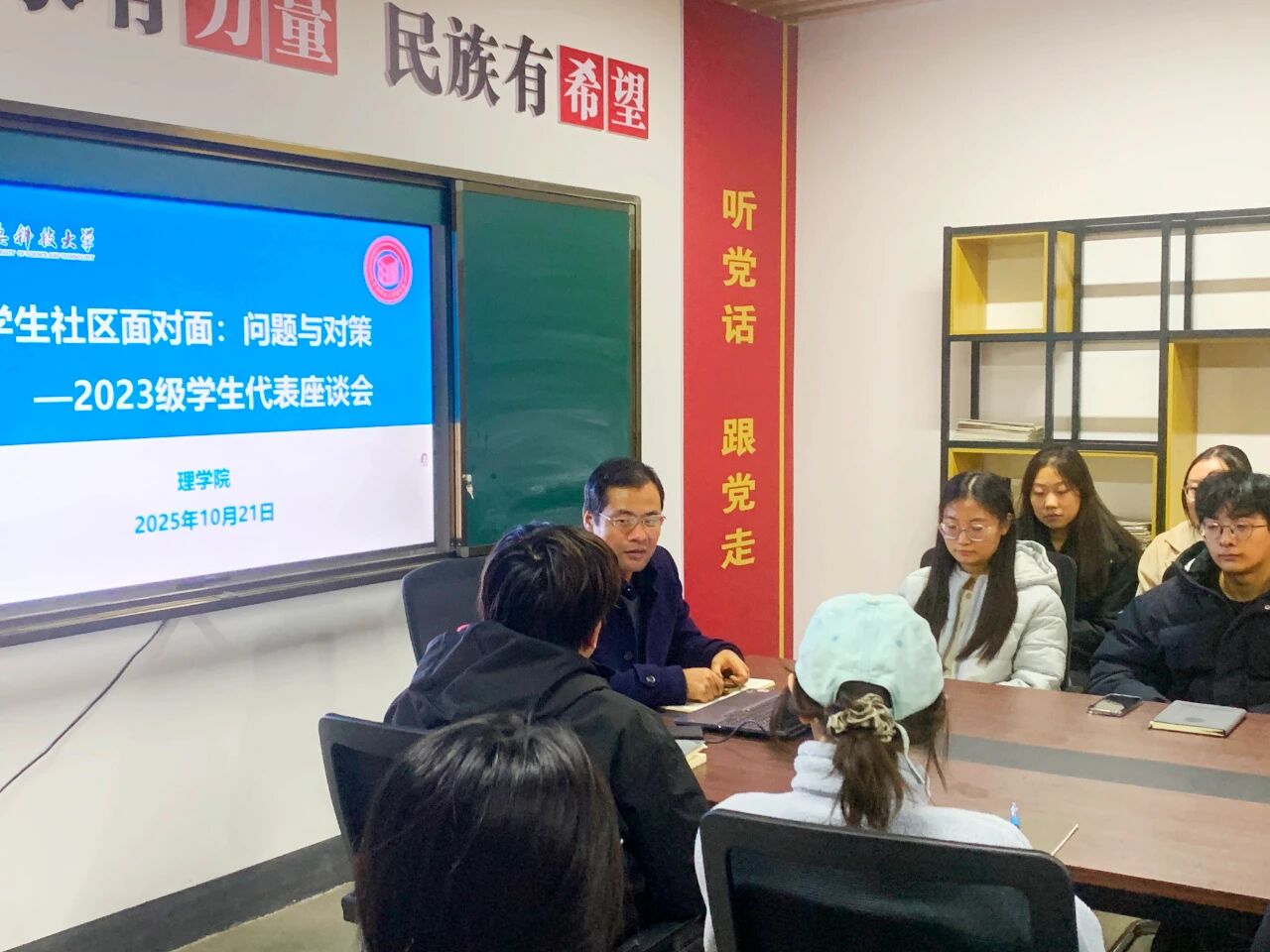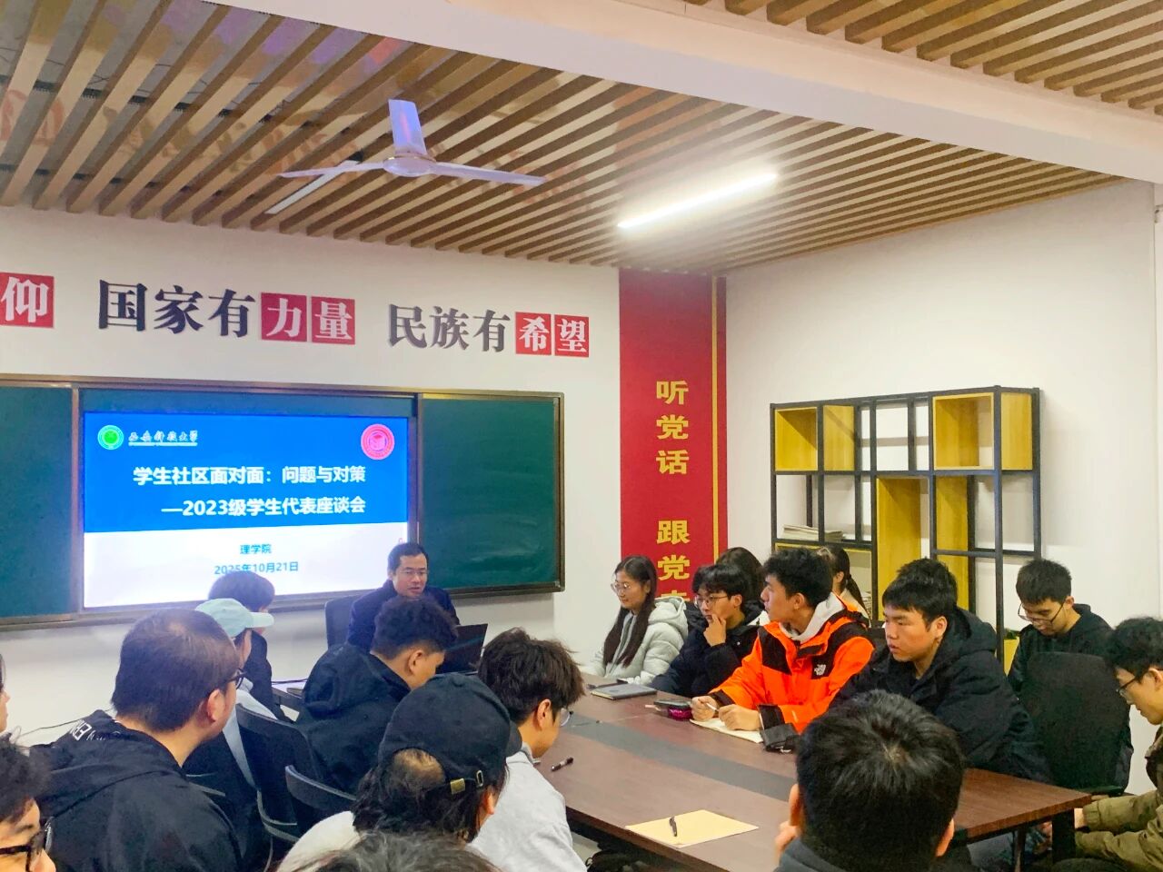 在交流环节,同学们结合自身感受进行了简要发言,提出了在课程学习、时间管理等方面遇到的一些普遍性困惑。侯斌刚认真听取了每一位同学的发言,并就相关问题进行了及时的回应与记录。