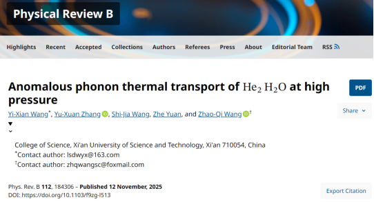王乙先副教授与王朝棋副教授团队在高压物理研究领域取得重要进展。其关于高压下He2H2O异常声子热输运行为的研究成果,以“Anomalous phonon thermal transport of He2H2O at high pressure”为题发表于凝聚态物理领域权威期刊《Physical Review B》(自然指数期刊)。该成果由王乙先副教授担任第一作者,2023级硕士研究生张宇轩为第二作者,王乙先、王朝棋副教授共同担任通讯作者,太阳成集团tyc122cc为唯一通讯单位。研究揭示了氦-水化合物在高压下的异常声子热输运机制,其显著的声子热传输抑制效应可能会改变冰巨星深层的电导分布和抑制氢-氦相分层,为解释冰巨星内部的多极磁场与异常热流,以及理解其动力学过程与热演化历史提供了关键理论依据。