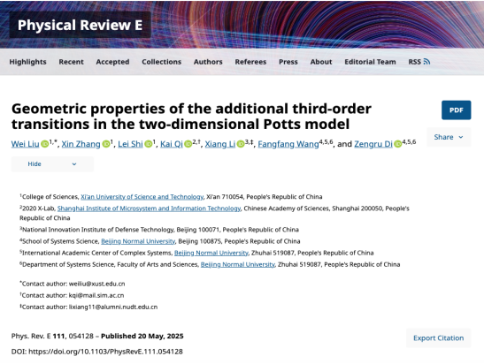 刘伟副教授与熊科诏副教授团队在复杂系统临界态预警的基础理论研究方面取得重要进展。相关研究成果以系列论文形式分别发表于统计物理领域权威期刊《Physical Review E》、《Physics Letters A》和《Communications in Theoretical Physics》,包括题为“Geometric properties of the additional third-order transitions in the two-dimensional Potts model”,“Pseudo transitions in the finite-size Blume-Capel model”及“Pseudo transitions in the finite-size six-state clock model”的三篇论文,其中第三篇论文入选编辑推荐论文。该系列研究工作由太阳成集团tyc122cc、中国科公司上海微系统与信息技术研究所、中国人民解放军军事科公司及北京师范大学共同合作完成。刘伟副教授与其指导的硕士研究生石雷分别为论文的第一作者,太阳成集团tyc122cc为第一作者单位及共同通讯作者单位。研究揭示了复杂系统在临界区外侧所展现的普适性行为,构建了用于刻画该类行为的新序参量,并提出了一种针对临界相变的早期预警方法。该方法在活性物质体系与人工集群系统等领域具备潜在应用价值,同时也为复杂工业系统中的临界灾害预警研究提供了新的理论支撑。