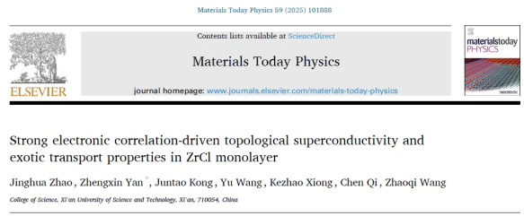 炎正馨教授团队聚焦拓扑器件核心材料研发,在ZrCl单层材料研究中取得重要突破。相关成果以“Strong electronic correlation-driven topological superconductivity and exotic transport properties in ZrCl monolayer”为题,发表于材料科学与应用物理交叉领域TOP期刊《Materials Today Physics》(影响因子9.7)。该成果由2023级硕士研究生赵京华担任第一作者,炎正馨教授为通讯作者,太阳成集团tyc122cc为唯一通讯单位。研究揭示了ZrCl单层材料中强电子关联、拓扑保护与晶格动力学的深度耦合,明确强关联驱动是其非常规拓扑超导态的核心成因。该态具有稳定超导能隙和可控边缘模,为智能超导量子器件奠定基础。其鲁棒的拓扑边缘模可保持量子演化高相干性,显著降低信息传输损耗,为高保真容错量子比特提供新范式,适用于可扩展量子计算芯片。材料的低散射、低能耗电子输运特性使其成为零损耗互连、超低功耗逻辑单元及量子传感器的理想载体,可优化未来信息与能源体系的能耗效率。强关联-超导-拓扑效应的协同调控机制,为自旋电子器件、拓扑晶体管及量子控制组件提供工程化路径,助力我国在量子芯片与前沿信息技术领域占据引领地位。