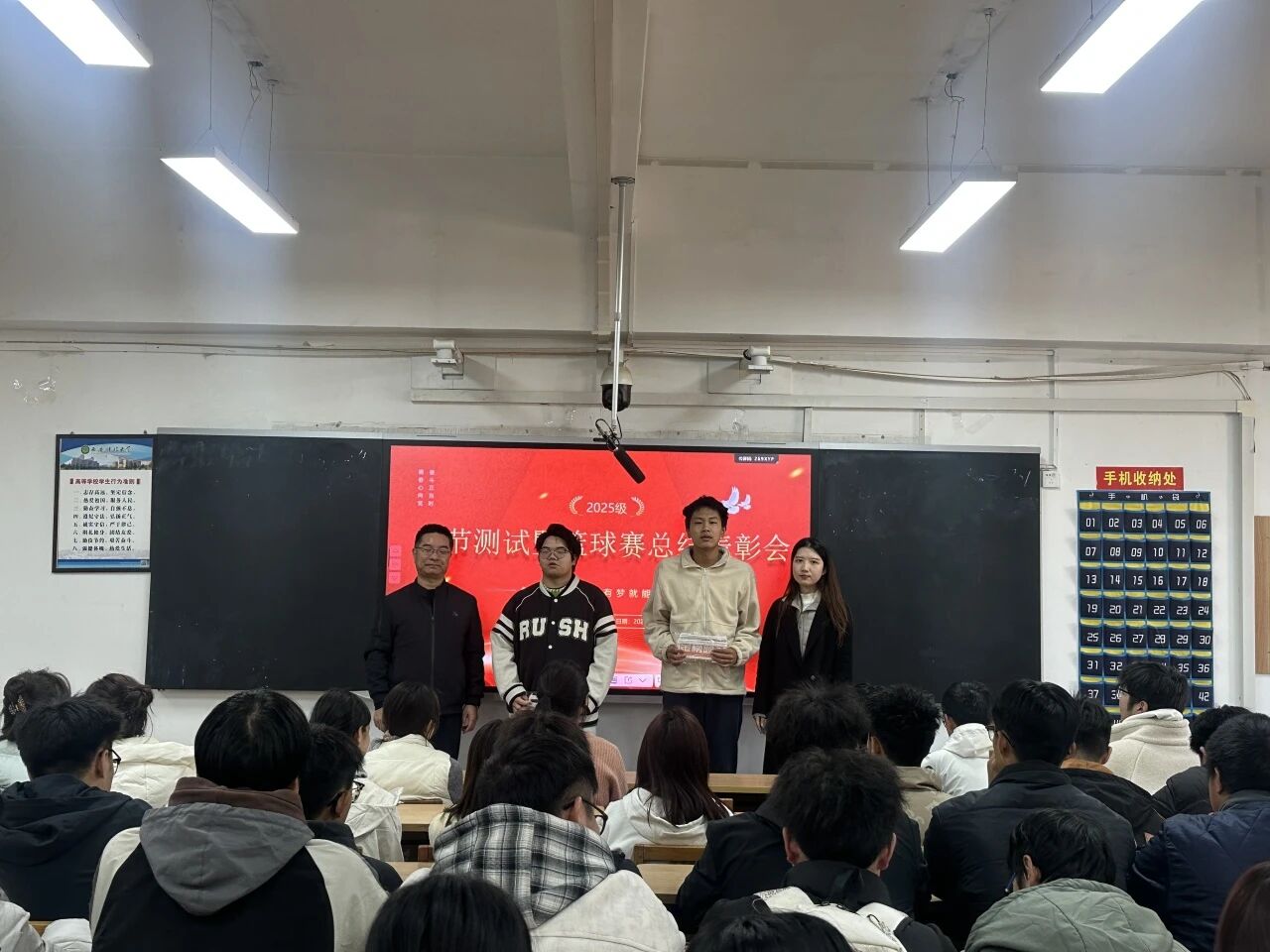 在篮球赛颁奖环节,陈伟伯为在“班BA”篮球联赛中表现突出的同学们颁发了奖品,表彰他们在赛场上展现出的拼搏精神与团队协作能力。获奖名单如下: