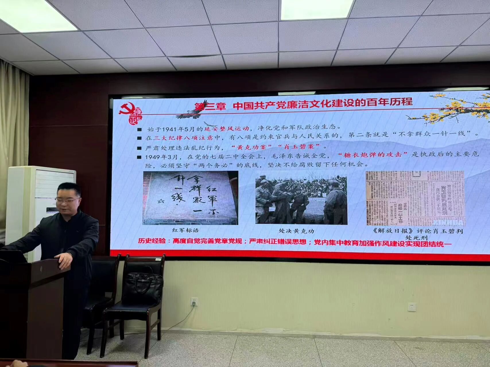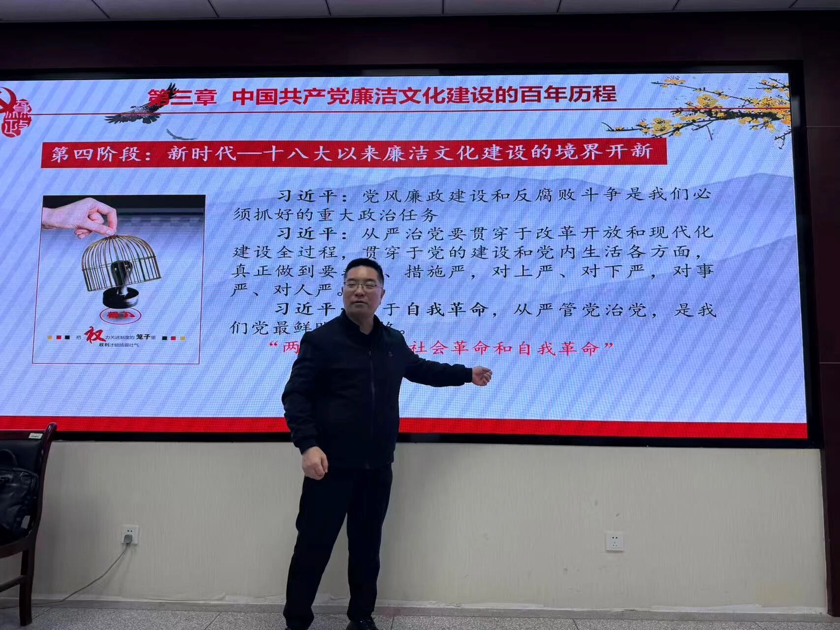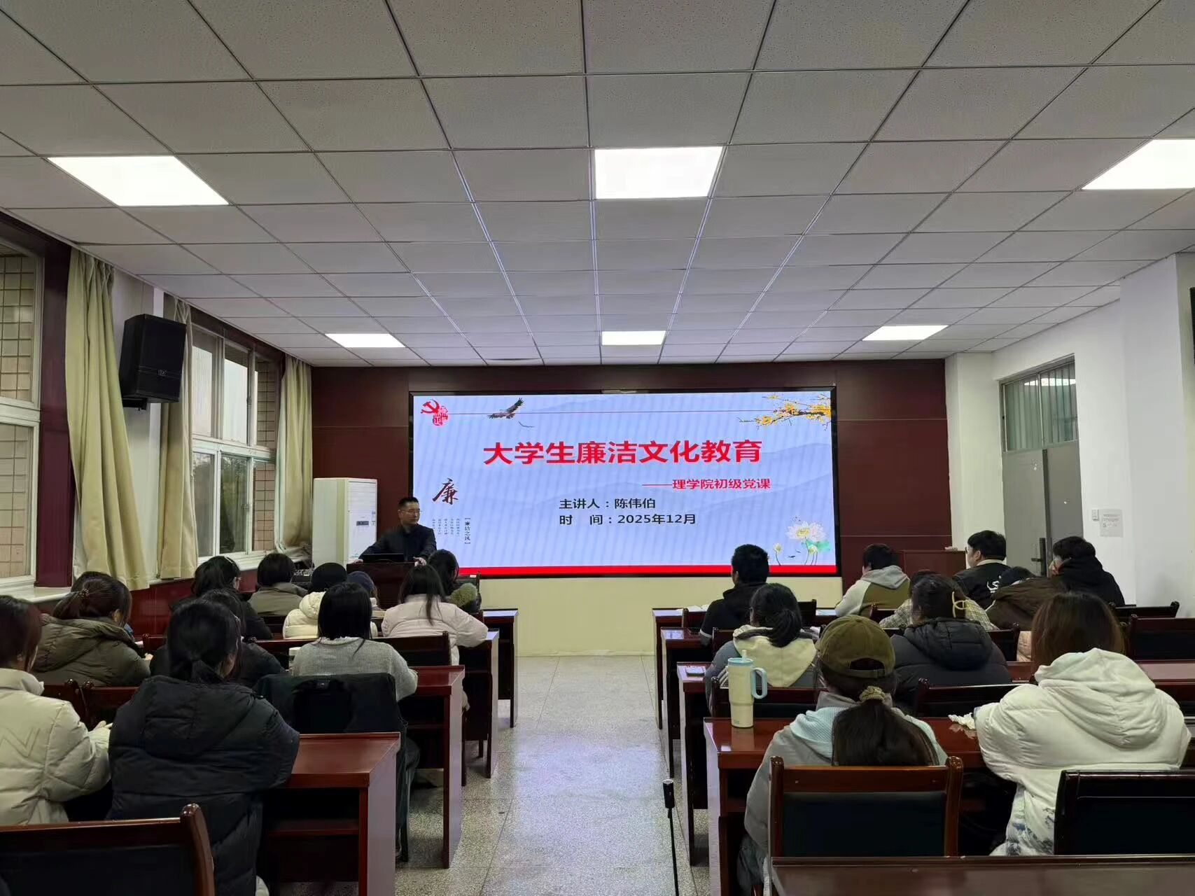 在老员工廉洁文化教育环节,陈伟伯结合高校育人使命,从中国传统廉洁文化的思想精髓、马克思主义的廉洁思想、中国共产党廉洁文化建设的百年历程以及新时代老员工廉洁行为养成四方面展开,倡导同学们传承红色精神、科学家精神,严守学术诚信,抵制功利浮躁,扣好政治人生的“第一粒扣子”。