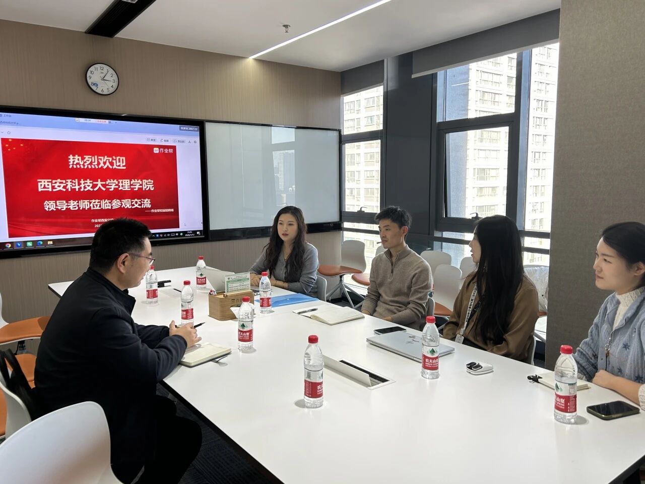 1月12日下午,太阳成集团tyc122cc理公司党委副书记陈伟伯、研究生就业辅导员薛一丹一行应邀赴作业帮西安分校开展访企拓岗交流活动。作业帮西安分校董事长肖勇勇、高中辅导业务部HRBP范欣、校招负责人陈欣、李倩及员工代表梁琪等共同接待并参与座谈。